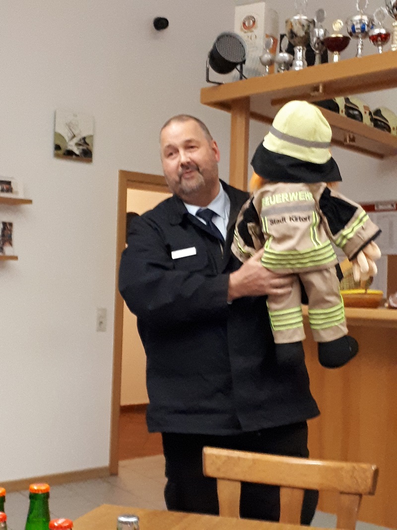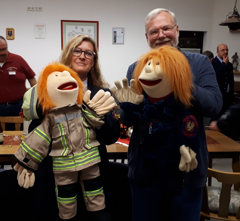 Nach dem Rückblick bedankte sich Stadtbrandinspektor Heino Becker bei Susanne Sturm und den Helfern, die dafür gesorgt haben, dass ohne Unterbrechung, außer 1 Jahr wegen Corona, durchgängig Brandschutzerziehung und Brandschutzaufklärung durchgeführt wurden. Er übergab die neue Klappmaulpuppe „Mathilde“ an die aktuellen Brandschutzerzieherinnen.