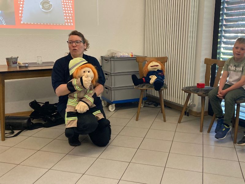 „Was brennt?“ lautete die Frage, die von der Fachbereichsleiterin Susanne Sturm gestellt wurde. Eigentlich eine einfache Frage, doch schnell bemerkten die Kinder anhand von anschaulichen Versuchen, dass ein Feuer nur entsteht, wenn das Verhältnis von Wärme, Sauerstoff und brennbarem Material stimmt. Wenn diese Voraussetzungen jedoch stimmen, kann auch ein kleines Feuer schnell außer Kontrolle geraten. Nun erklärten der Feuerwehrfrauen, wie sich die Kinder in einer solchen Gefahrensituation verhalten sollten.