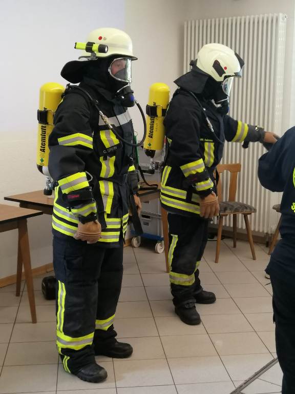 Jan-Mika Salzmann und Carolin Grein präsentierten die Schutzausrüstung eines Atemschutzgeräteträgers. Besonders beeindruckend waren natürlich die Feuerwehrautos und die Ausrüstung der Fahrzeuge, die von allen Seiten in Augenschein genommen wurden. Highlight für alle Kinder: Einmal in einem Einsatzfahrzeug wie echte Feuerwehrleute sitzen zu dürfen.
