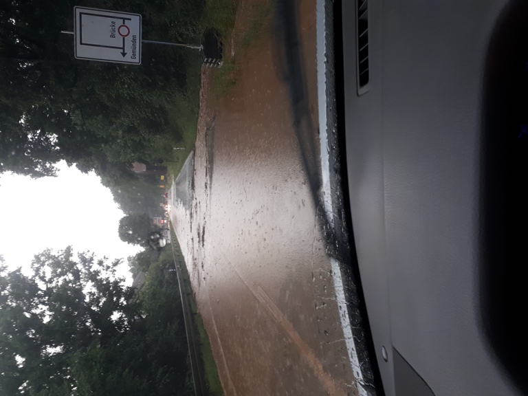 Am Mittwoch, gegen 19.38 Uhr, wurde die Feuerwehr Kirtorf-Mitte zu einem umgestürzten Baum, in den ein PKW hineingefahren war, auf der B 62, alarmiert. Beim Eintreffen an der Einsatzstelle zwischen Kirtorf und Ober-Gleen herrschte Starkregen und Sturm. Im verunfallten PKW befanden sich ein Erwachsener und ein Kleinkind. Die Feuerwehr brachte die Personen in Sicherheit und zog sich, aus Gründen des Eigenschutzes, erstmal in sicheres Gebiet zurück. Nachdem der Sturm etwas nachgelassen hatte wurde der PKW befreit. Durch die Wasser- und Schlamm/Geröllmassen an verschiedenen Stellen der B 62, musste diese komplett gesperrt werden. Autos kamen ins Schwimmen beim Verlassen der Straße. In Richtung Lehrbach waren Gesteinsbrocken von bis zu einem halben Meter Durchmesser auf die Straßen gespült worden. Auch hier war die Straße komplett dicht. Jetzt kamen in Kirtorf noch überflutete Straßen und vollgelaufene Keller hinzu.