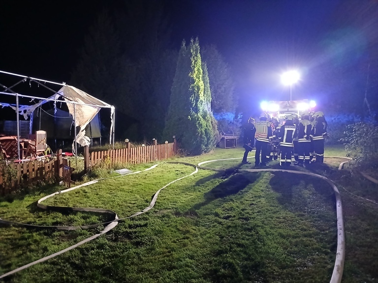 Beim Eintreffen der ersten Einsatzkräfte standen 3 Wohnwagen und ein Vorzelt im Vollbrand. Eine angrenzende Baumreihe und Hecke waren ebenfalls vom Feuer betroffen. Von einem Jagdpächter und Anwohnern wurde berichtet, dass es zu 2 Verpuffungen gekommen sei. Durch weitere Gasflaschen an der Einsatzstelle wurde die Arbeit der Feuerwehr erschwert. Die Priorität lag bei der Personensuche und der Brandbekämpfung. Ein Ausbreiten des Feuers konnte durch das schnelle und gezielte eingreifen der Feuerwehr verhindert werden. Beim Löschen wurde in einem verbrannten Wohnwagen, eine leblose Person entdeckt.
